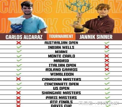 总的来看,阿卡在上半年的大赛表现要比下半年更好,而辛纳则正好反过来了。还未曾夺得的大赛方面,除了奥运会单打金牌外,阿卡缺了澳网、罗杰斯杯、上海大师赛、巴黎大师赛、年终总决赛以及戴维斯杯;辛纳则没有印第安维尔斯大师赛、红土三大赛蒙特卡洛、马德里和罗马大师赛以及法网。