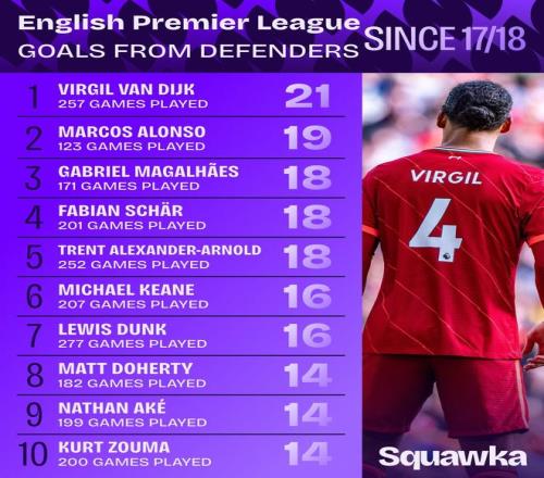 1718赛季至今英超联赛后卫进球榜:范戴克21球第一